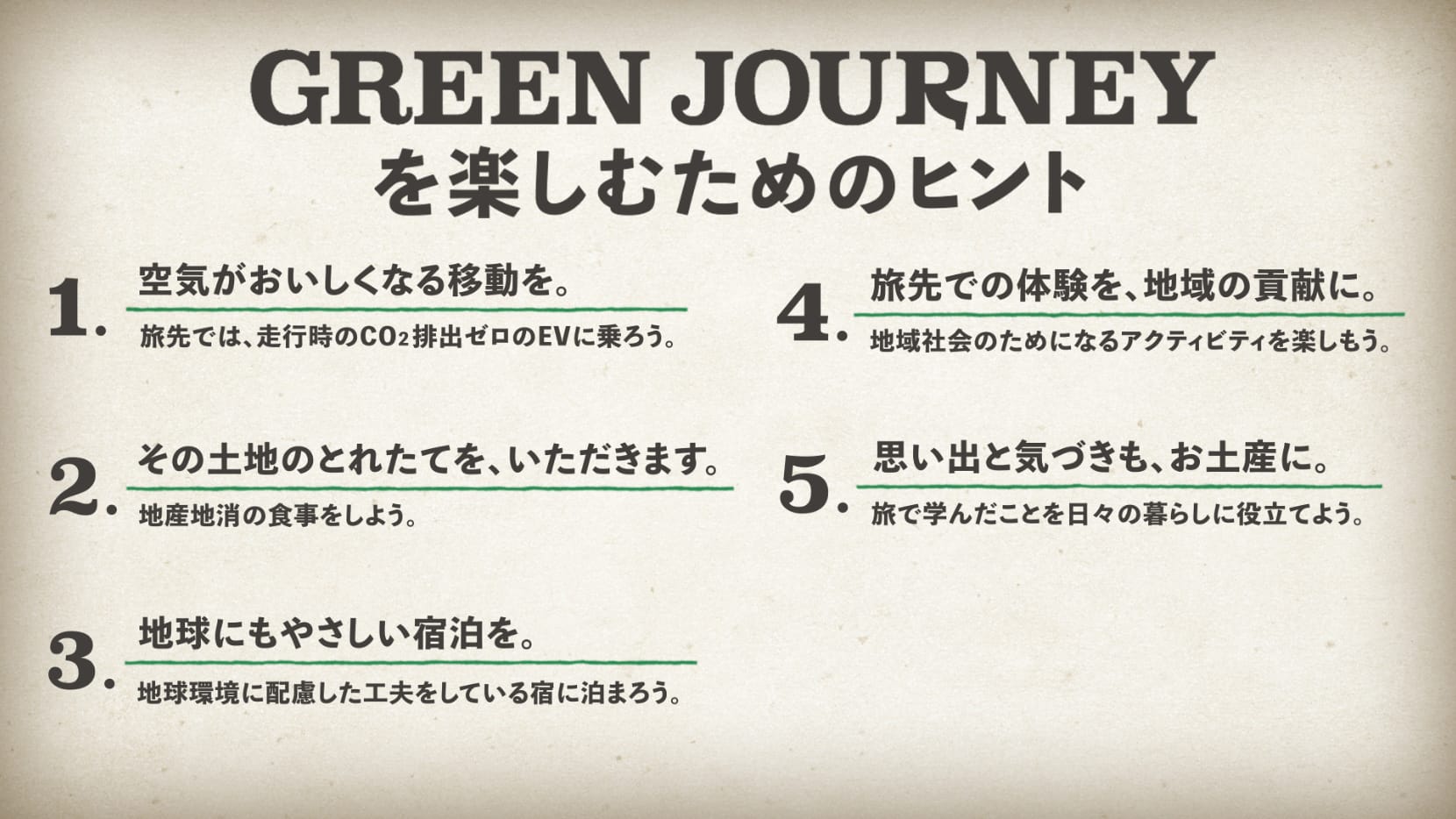まず、GREEN JOURNEYの「環境にやさしく、地域はうれしく、自分たちはとことん楽しい旅」というコンセプトと5つのポイントを学びました。